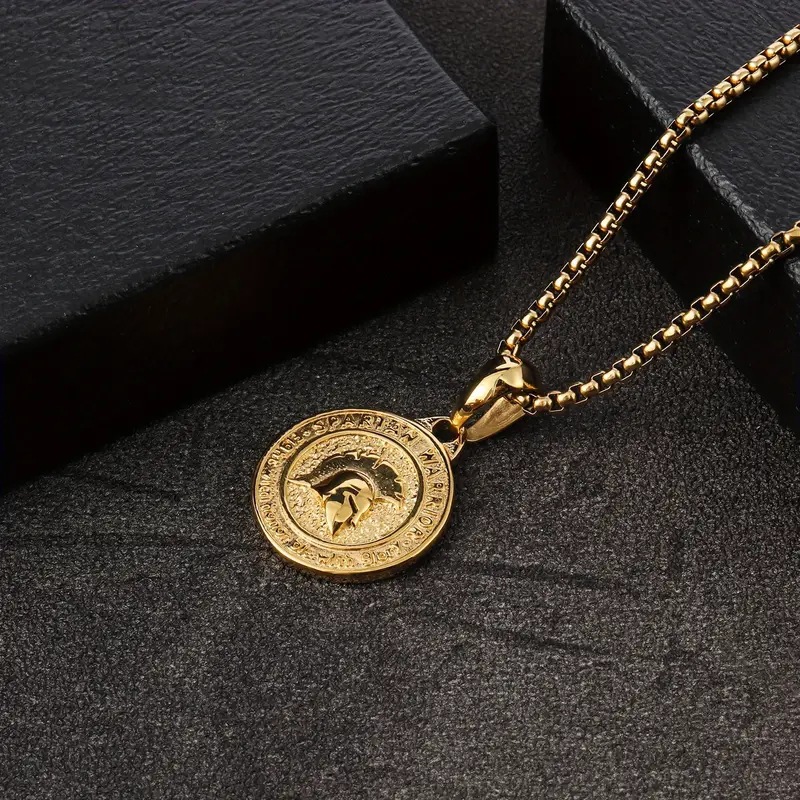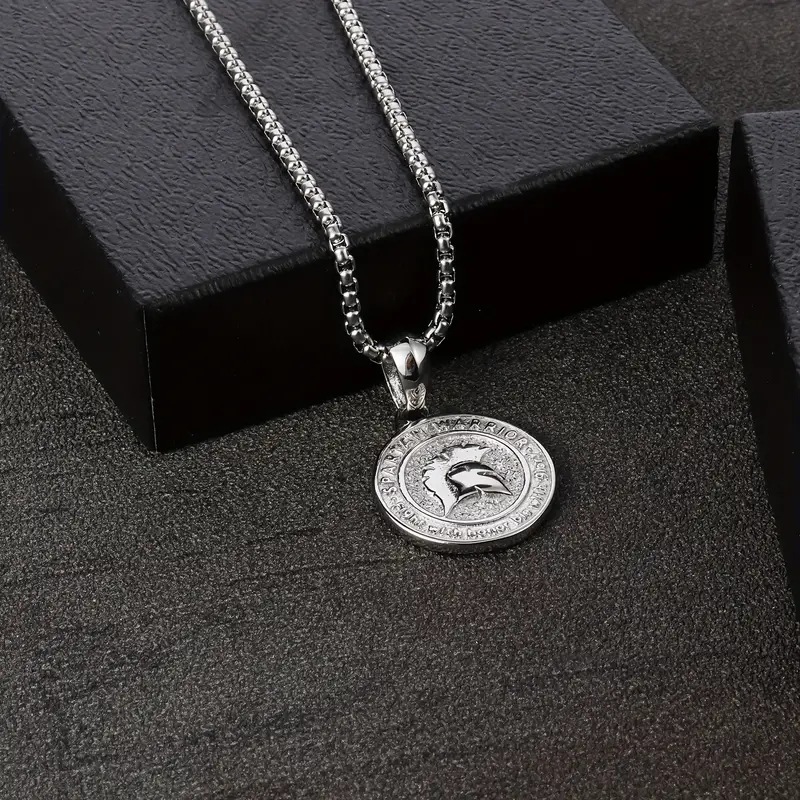 Jewelry Features: Material : Titanium steel – durable and hypoallergenic, Finish : Electroplating (gold or silver plated), Available Colors : VESN0675G: Gold VESN0675S: Silver, Pendant : Round shape, gladiator style, Pendant Size : 2.5 cm (≈ 0.98 in), Style : Geometric, masculine, Target Audience : Men, but also unisex depending on taste