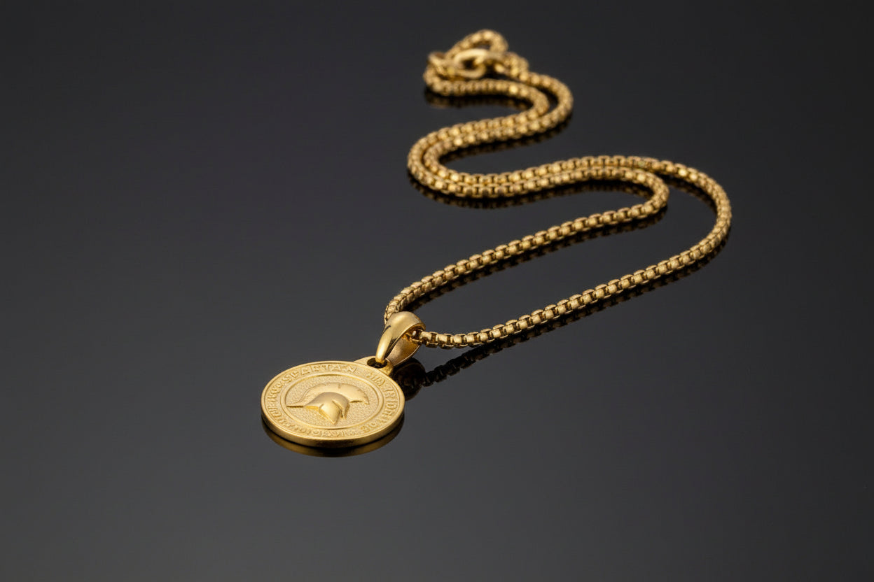 Caractéristiques du bijou: Matériau : Acier titane – durable et hypoallergénique, Finition : Galvanoplastie (plaqué or ou argent), Couleurs disponibles : VESN0675G : Or VESN0675S : Argent, Pendentif : Forme ronde, style gladiateur, Taille du pendentif : 2,5 cm (≈ 0,98 in), Style : géométrique, masculin, Public : Homme, mais aussi unisexe selon les goûts