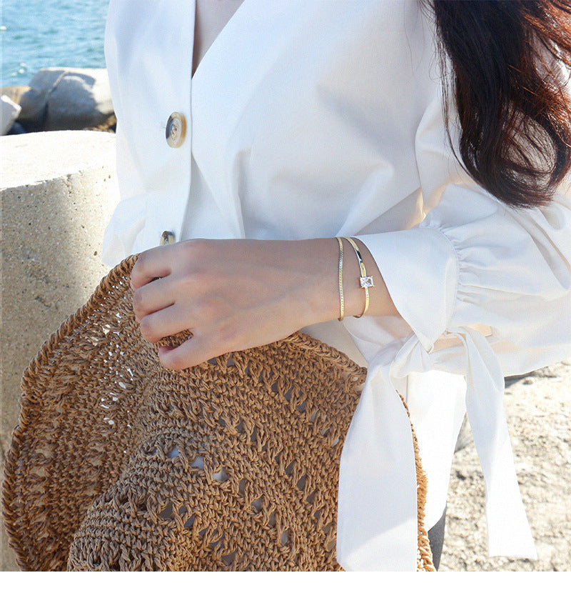 Ce bracelet double rang en argent 925 plaqué or est une pièce moderne et élégante conçue pour mettre en valeur un zircon carré haute brillance 4A.